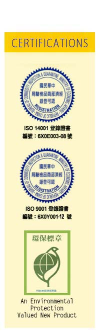 ISO-14001 international environmental management system accreditation by the Bureau of Standards, Metrology & Inspection, Ministry of Economic Affairs.