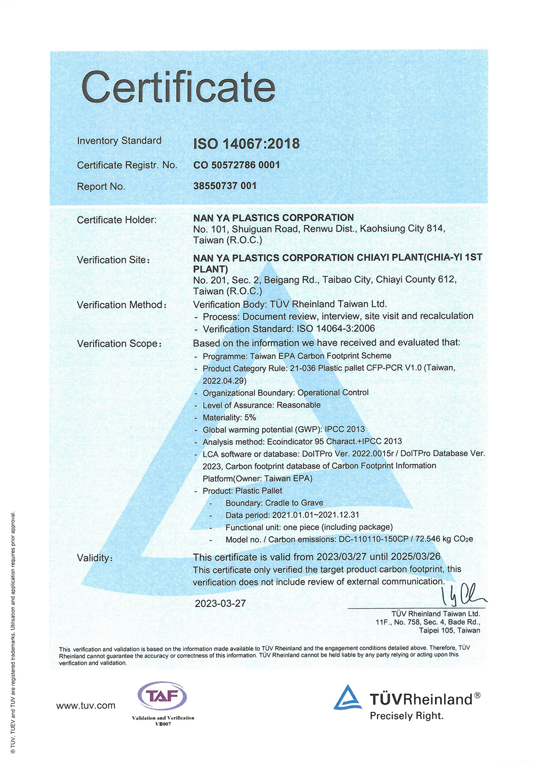 The plastic pallets were verified by the EPA, Executive Yuan to conform with 100% renewable plastic/rubber product standards and were awarded “Green Mark Certification No. 0870.”